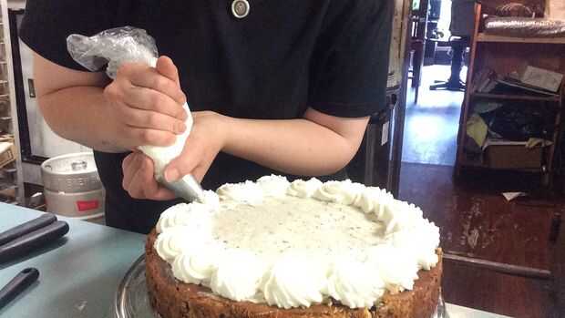 Estamos listos para algunos rosetones de crema batidos alrededor del borde de la tarta de queso. Cubre los bordes muy bien y añade un toque profesional que da la presentación.