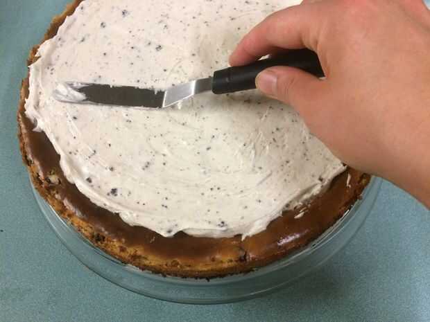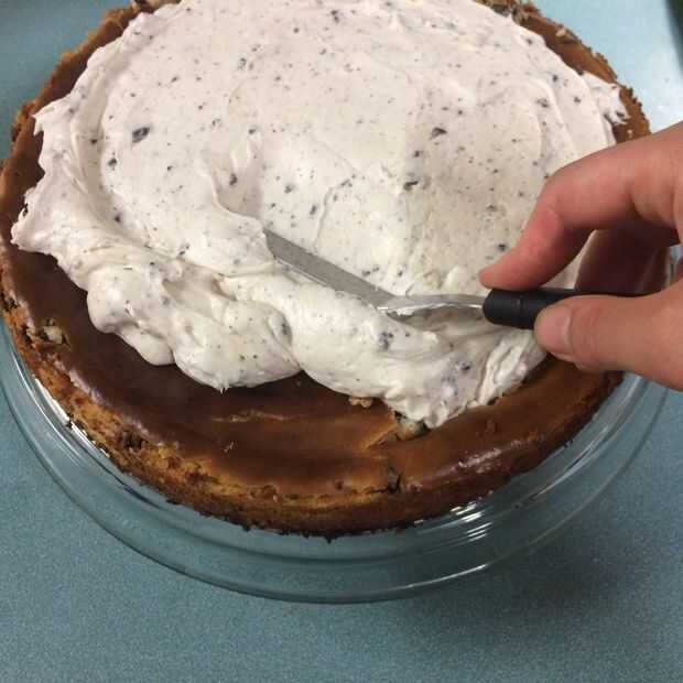 Poner el n de cookies' topping crema sobre tu tarta de queso y la extensión alrededor con su pequeño offset espátula (o cuchara si no tienes uno). No tiene que preocuparse por ir hacia los bordes, causa que vamos a cubrir con crema batida.