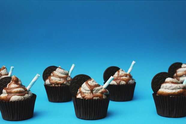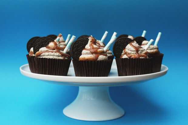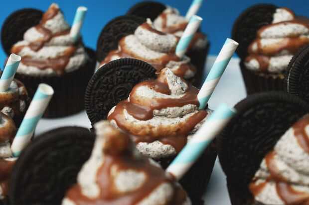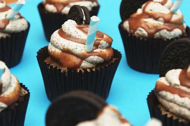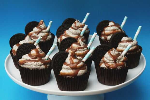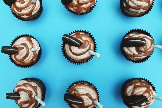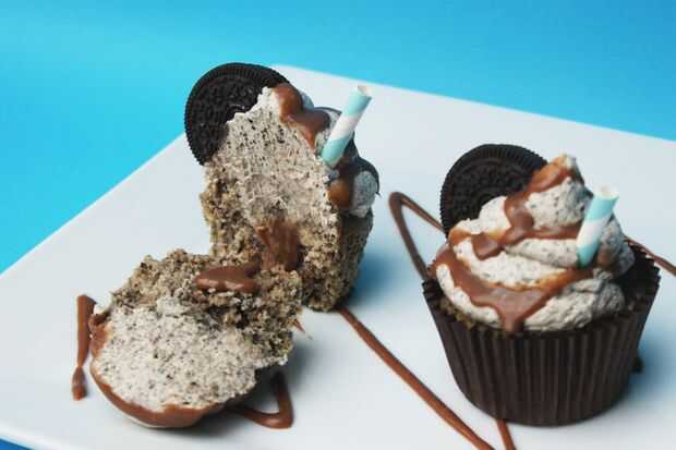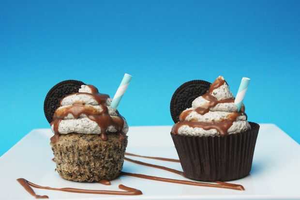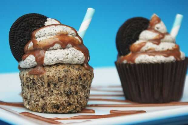 estas Cookies & cupcakes crema son para morirse!  Son la cantidad perfecta de galleta Oreo y crema.  Una vez que uno come... no hay parar.Equipo necesario:-2 latas de muffin, sostiene 12 muffins-forros de muffin de papel 24-medianas 2 recipientes de