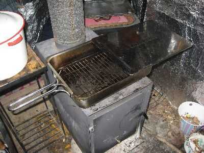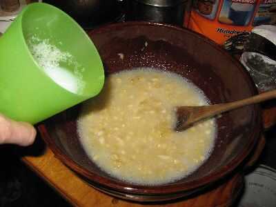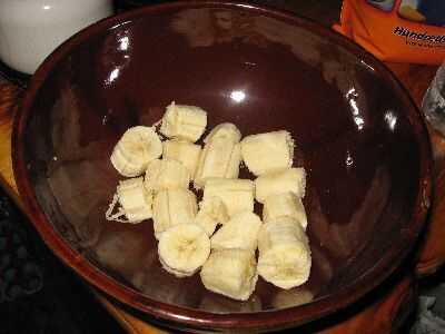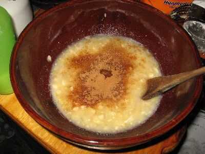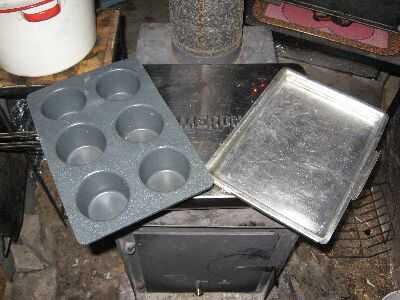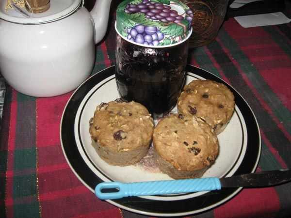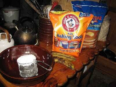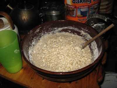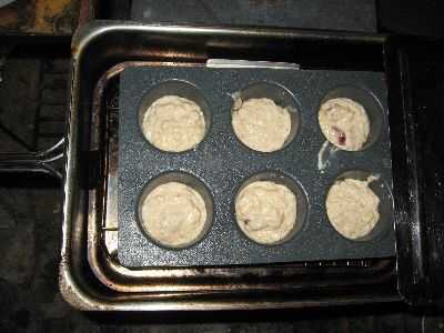 Precalentar el recipiente de horno. Puré de plátanos en medio de tamaño bowl con cortador de pastelería (o cuchara o tenedor). Añadir leche a los plátanos y remover ligeramente dejando pequeños trozos de los plátanos. Añadir especias, bicarbonato de Sosa. Revolver. Tamizar en unos batidos de harina, revolviendo cada vez hasta que se mezcla bien. Añadir la harina de avena y fruta paquete Stir. Coloque 2 cucharadas de amontonamiento en cada lugar en un molde de muffin. (Tengo los bollitos en las fotos en una tienda de segunda mano por $5. Doble y no tiene que ser cubierto con aceite o Crisco.) Hornear 2 horas o hasta que esté cocinada a fuego medio, figura alrededor de 1 y 1/2 horas sobre un fuego rugiente.