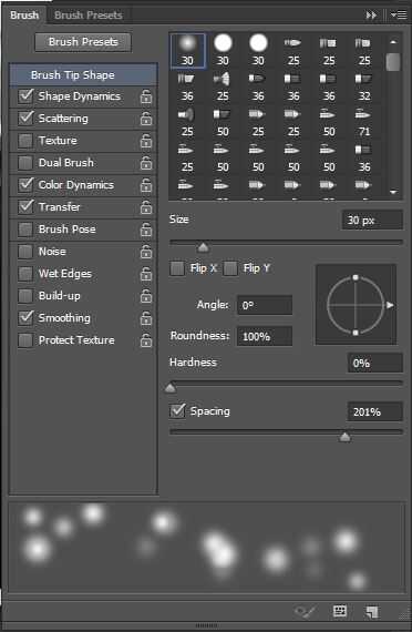 Vas a crear otro cepillo, pero esta vez las estrellas, así que vuelva a abrir su ventana de cepillo y vuelva a seleccionar el soft redonda. establece su forma de punta de pincel en la configuración que tengo en foto 1