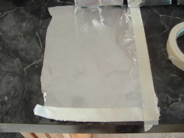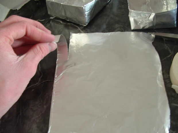 Si tienes un rollo de cinta de 3/4 pulgadas ahora es un buen momento para usarlo. Dos lados adyacentes de la cinta con la cinta apenas tocando el borde y paralela a la pieza de papel de aluminio. Hacer una muesca en el borde de la cinta. Vuelta pedazo de papel de aluminio para que no se pueden ver la cinta. Tire el pedazo de papel donde la cinta es en el otro lado. Usted debe ser capaz de hacer una lágrima limpia de la cinta. El nuevo pedazo de papel de aluminio debe ser 3/4 de pulgada menor anchura y longitud sabio. El video es el completo para hacer el superior de la caja.