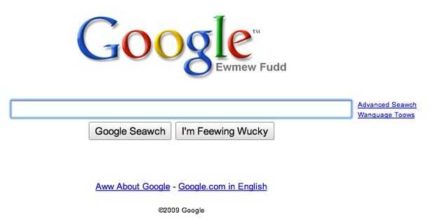 Para obtener Elmer Fudd, escriba en "ewmew fudd" en la barra de búsqueda de Google y luego pulse "Estoy Feeling Lucky".