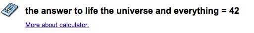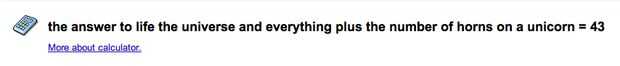 Tipo en "la respuesta a la vida el universo y todo" en la barra de búsqueda de Google. Luego oprima "Búsqueda Google". La calculadora de Google aparece y dice es igual a 42. Realmente no entiendo. Tal vez que usted. Escriba en "la respuesta a la vida el universo y todo lo demás más el número de cuernos de unicornio" y resuelve a 43.