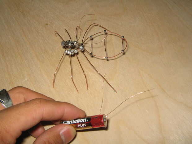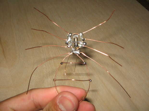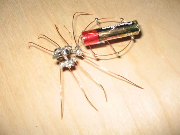 fresco araña que se puede hacer con solo un motor eléctrico, cables y batería, puedes hacerlo girar hacia atrás y forma con sólo una curva en las patas de araña.