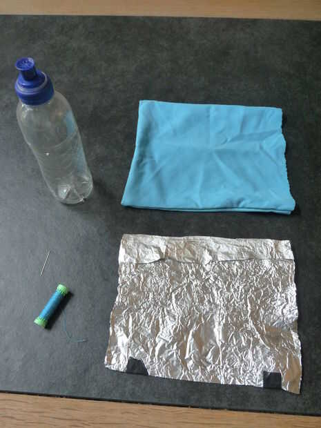 -Una 0, botella de 5L -Tela tamaño 24 x 24. (se recomienda doble capa) -La aguja y del hilo de rosca -Papel aluminio (tamaño 20 x 24) -Tijeras (no en foto) -Marcador (no en foto)