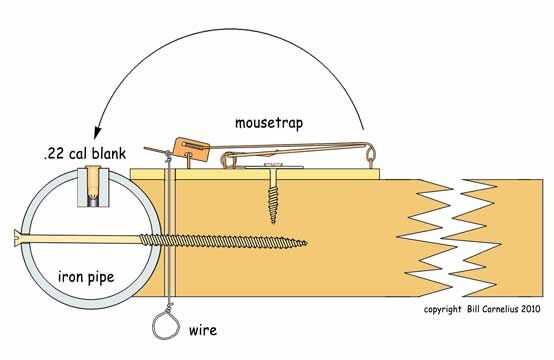 Utiliza un banco de cal.22 como carpinteros usan para encender los pernos de orejeta en cemento. Volumen depende del tamaño del cartucho utilizado, tiendas de madera tienen en 5 tamaños para varios cemento dureza y perno largo. Algunos nombres de marca son Ramset (HD22, RS22, 721, 4170, M70), Remington (476, 490), Simpson Strong Tie (P22AC4, P22AC4,) y Hilti (DXE37, DXE72). Son color cifrado y ordenados según el número, 1 (gris) es la carga más ligera y 5 es el más alto (no he visto #5), 4 (amarillo) está junto al más alto. Aquí está algunos de Home Depot en cajas de 100 para $7. La carga más pequeña parece funcionar bien pero nuestro no es un oso muy grande. Yo he sido adjuntarlos al tronco por lo que van a estar a la altura de la oreja cuando el oso está de pie sobre sus patas traseras, pero es probablemente mejor montarlos en alto para no disparar al nivel de los ojos. Usar protectores auditivos o tapones para los oídos cuando estas trampas. Alguna protección para los ojos también puede ser una buena idea.