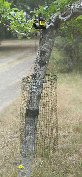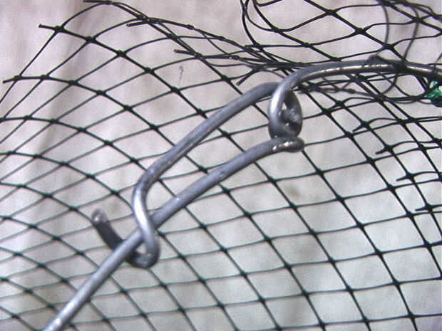 Un thingie neto puede conectarse el cacharro de oso para que el peso de todo el árbol que sube se tire hacia abajo y la trampa de resorte. Está hecha de un aro de #8 o #9 alambre pesado peso plástico Ave y neto. Esto ayuda a tener un tornillo de banco y alicates grandes para formar este alambre de peso. Todavía no pesa prácticamente nada, pero compensación de peso ligero no es práctico. Mallas de plástico más pesadas tienden a tener superficies de amplia mancha "cordón" que se desliza a través de la corteza de los árboles donde ligero neto cuelga cada vez. Sospecho que la red solo les da cierta pausa aunque porque la trampa rara vez es despedida incluso cuando hace viento, y el árbol todavía está protegido. Recuerdan pueden todavía conseguir golpeado aunque hace unos años. O puede parecer demasiado rickity.