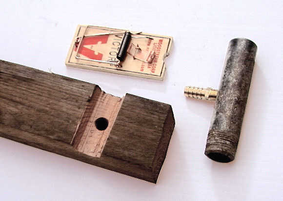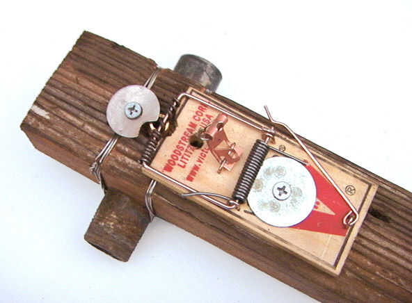 Elegí una lengüeta de la manguera de cobre amarillo porque estaba paseando la ferretería con una carcasa.22 en busca de un agujero de tamaño adecuado y un ajuste. Si no tienes un taladro, sospecho muchas cosas de metal disponibles tiene un orificio que funciona. Basta con mirar. Rosca la lengüeta de la manguera en el tubo para seguir con mi filosofía de diseño que son los fabricantes de ruido y no arma trampas, porque tenía las herramientas para hacerlo y era más barato que comprar un tubo de 1/8 de pulgada t a hacer lo mismo, pero eso también es una posibilidad. O caramba, sólo usar mucho pegamento y enterrar las piezas sin rosca de metal dentro de la culata de madera para la fuerza. Recomiendo Casa pegote porque es parecido a la goma, se pega a todo y resiste el choque. Sin embargo su naturaleza gomosa puede amortiguar el golpe del bopping cable si la cámara no es lo suficientemente masiva, o es floja, para no disparar la trampa. Limpie las manos con gasolina.