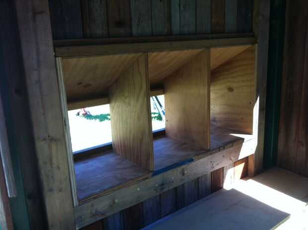 Aquí es interior vista de 3 cajas nido. Plan para conseguir a solamente 6 pollos, pero quiere tener suficientes cajas para 9. Estaba seguro de cómo construir las cajas nido externo lo realizaron en línea.