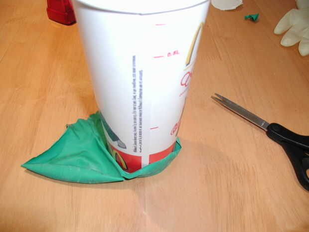 Corte globo o guante para conseguir un pedazo de látex lo suficientemente grande como para cubrir el fondo de la taza.