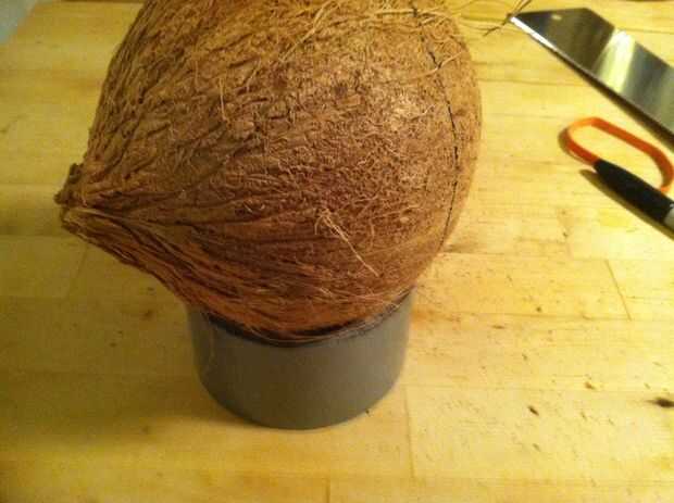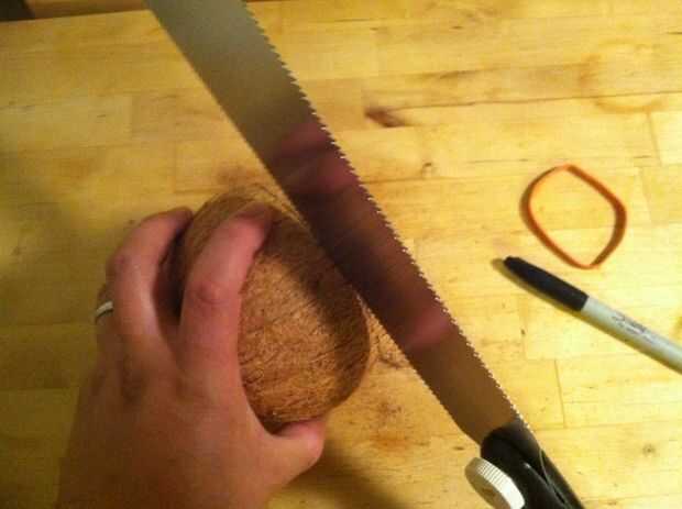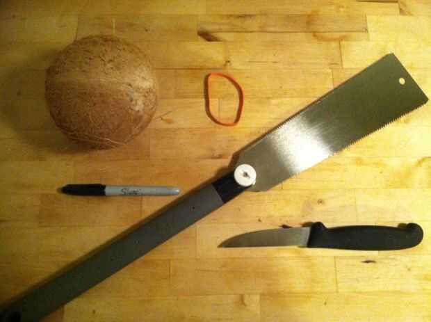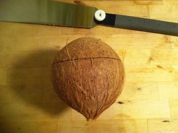 Sabe muchas más formas machos de abrir cocos, con el borde posterior de un machete es mi favorito, pero ya que estamos interesados en convertir la cáscara a una muy previsible de la forma encontrar la sierra mucho más eficaz en este caso.