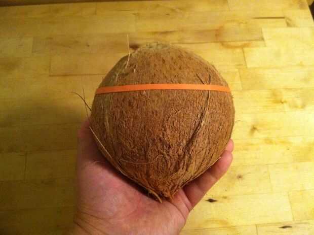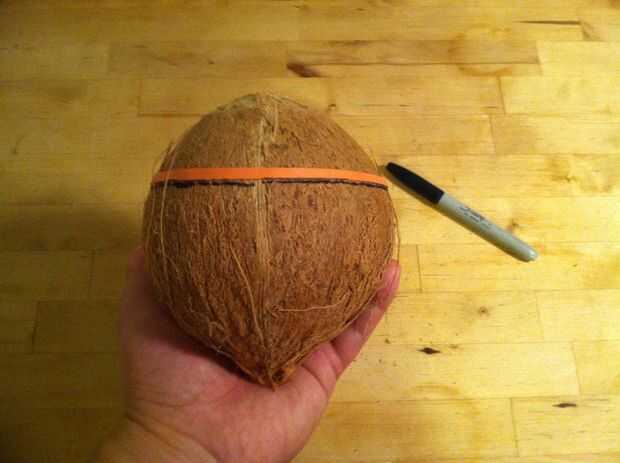 Empiece por escoger a un coco que se siente pesado para su tamaño, como redondo como y sin ojos suaves omolde. Para hacer una buena copa, utilicé una goma y había estirado alrededor del coco, hacia el final con los ojos. El extremo puntiagudo del coco será la tazón de fuente y al final con los ojos se convertirá en el pie de la Copa. Cortar el coco de esta manera es importante porque el lado con los ojos puede escaparse - trust me, he desordenado esto antes. Ajustar la banda elástica hasta que se ve plana todo; mejor línea de la banda, el aplanador el borde de la Copa y el pie será que significa menos lijado más adelante. Seguimiento de la banda de goma con un rotulador permanente o lápiz.