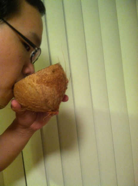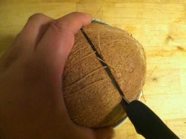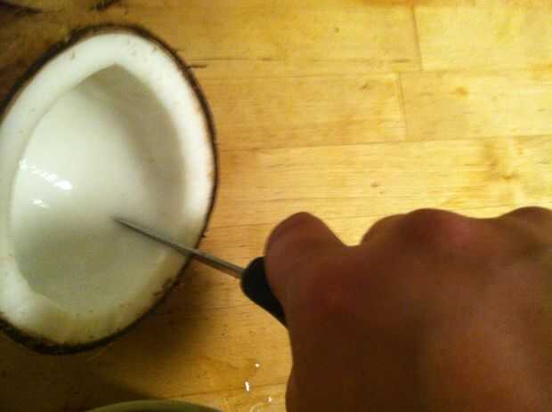 Tomar un cuchillo de cocina robusto y cortar la carne, como vas. Por favor, ser conscientes de sus dedos y el pulgar como haces esto. El coco debe pop aparte en poco tiempo. Si usted es realmente impresionante, puede inclinar el extremo puntiagudo del coco abajo justo a tiempo para mantener todo ese agua de coco dentro.