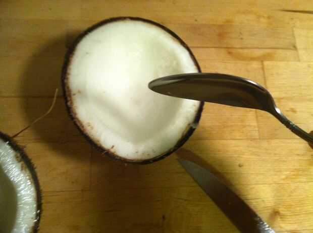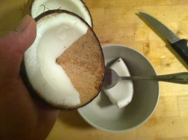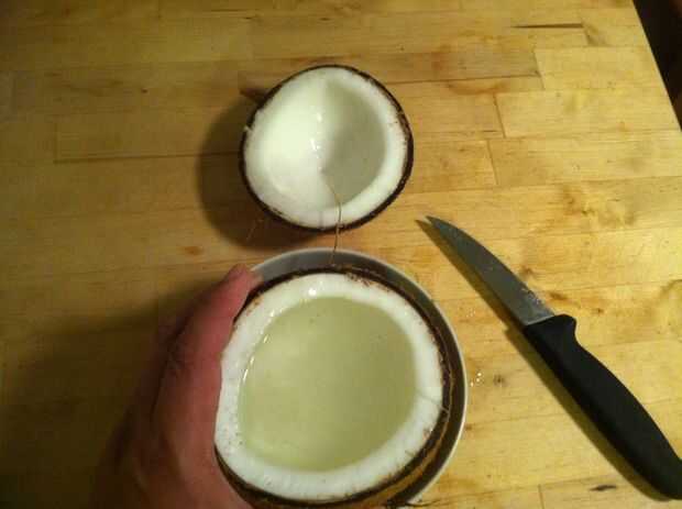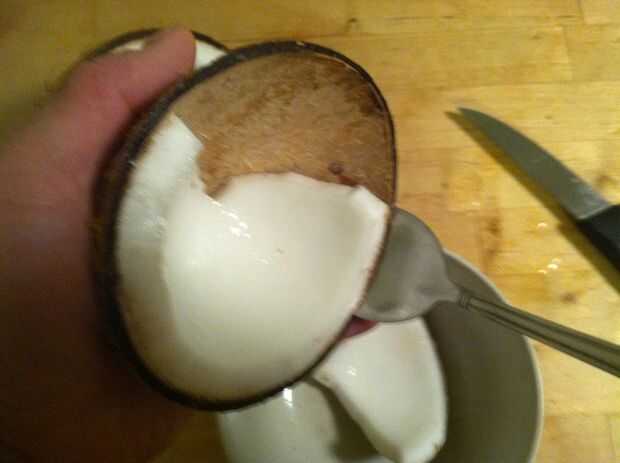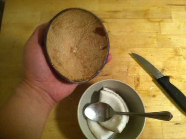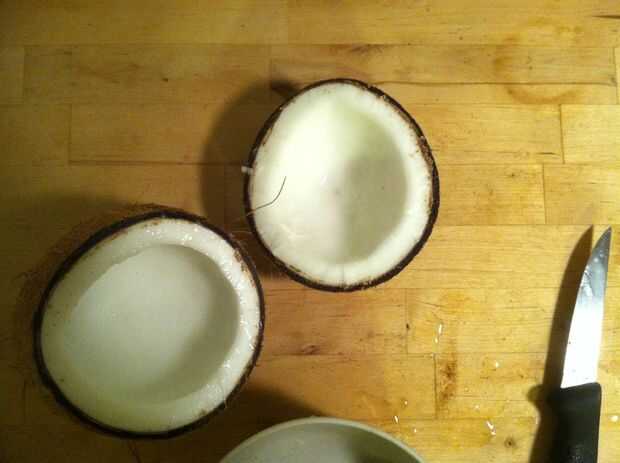 Por lo tanto, ahora tienes un coco que aún se mantiene unida por un montón de carne. Todavía habrá una buena cantidad de líquido en su interior, por lo que será probablemente un tazón de fuente para este siguiente paso, ligeramente más grande que el coco sí mismo.
