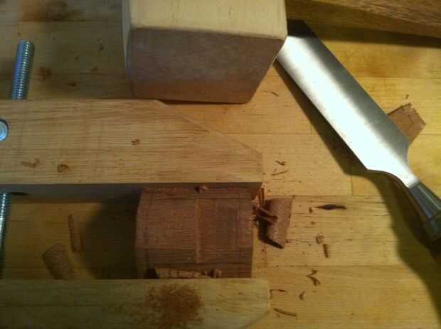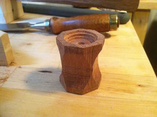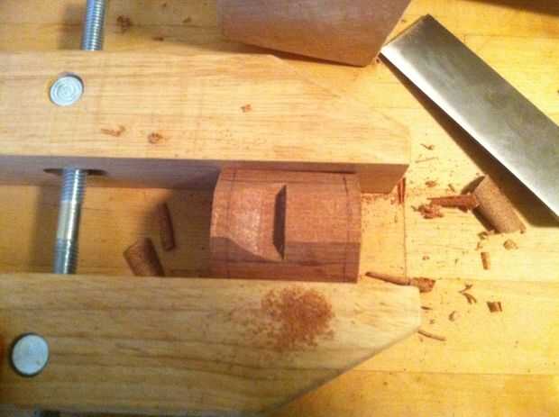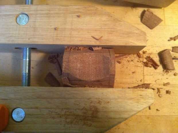 Comience marcando cada otro borde del Octógono con una línea al centro. Levante el bloque lo suficientemente alto en la prensa por lo que puede vio libremente por la mitad hasta que sólo cumple con las líneas. Inferior el bloque que está apuntalada contra la mesa y listo para cincel para picar. Poner el cincel biselado hacia abajo, hacia la madera, ayuda a formar la curva de la Vieira naturalmente. El corte de la sierra detiene su cincel de partir la madera en el otro lado. Girar el bloque alrededor y picar la otra mitad de la Vieira del mismo modo. Con sólo presión de la mano, pare apagado las partes ásperas de la madera y hacer una superficie más agradable.