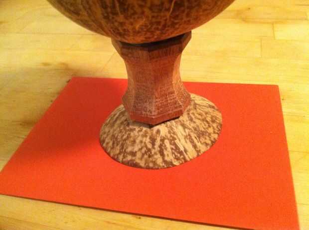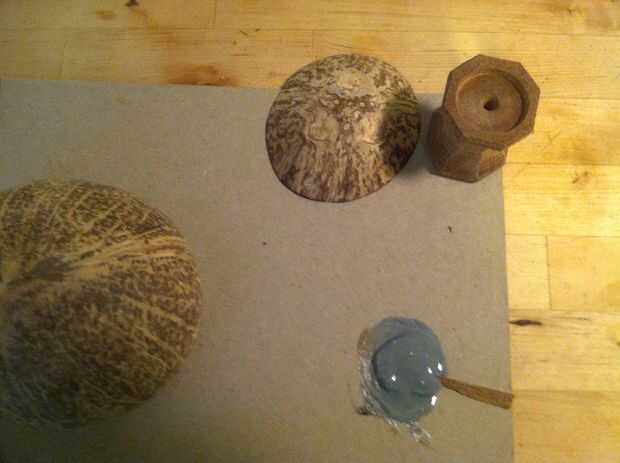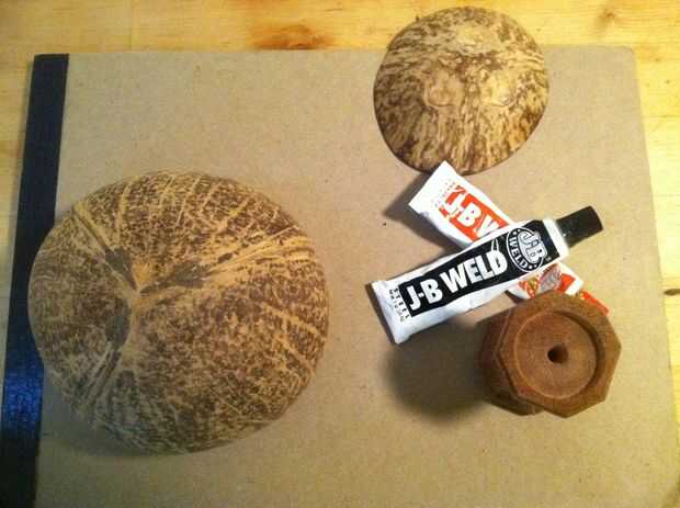 Repita el proceso y coloque el recipiente de su copa. El epoxi toma un poco de tiempo para curar, así que tome algún tiempo para nivelar el borde superior de la taza con el nivel (tal vez de su combinación de cuadrados). Si tu cáscara de coco es un poco más ovalado que circular, puedes rotar las cáscaras en este momento para equilibrar el aspecto de la taza.