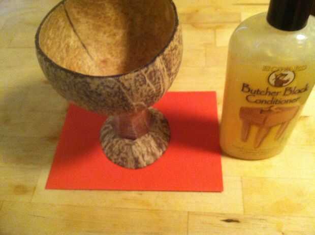 Acabado la Copa es bastante fácil. Usé Carnicero bloque acondicionador de Howard. Es seguro para el contacto incidental y directo con los alimentos. Siga las instrucciones; slather encendido, esperar (algunos más), limpie el exceso, repetir 3 + veces antes de darle un pulido final. Tuve algunos trapos de algodón de viejos pantalones pijama (bien limpio) que usado para untar y frotarse el acabado. Si usted ha intentado cualquier otros alimentos seguros sellos y acabados, por favor me avisan en los comentarios. Siempre estoy buscando cosas nuevas para probar!