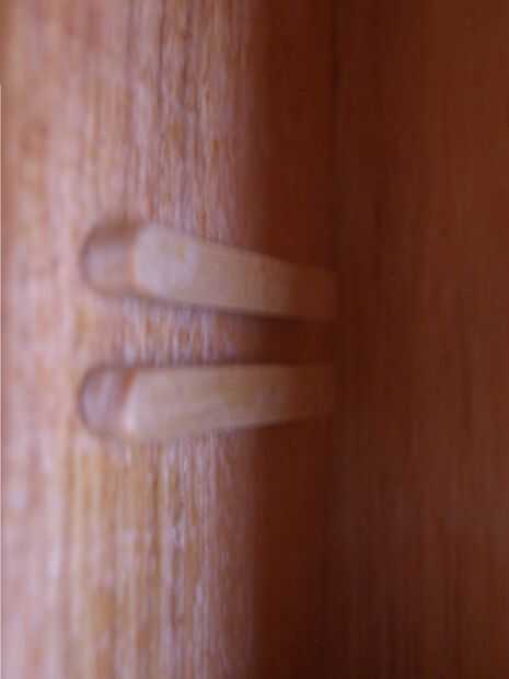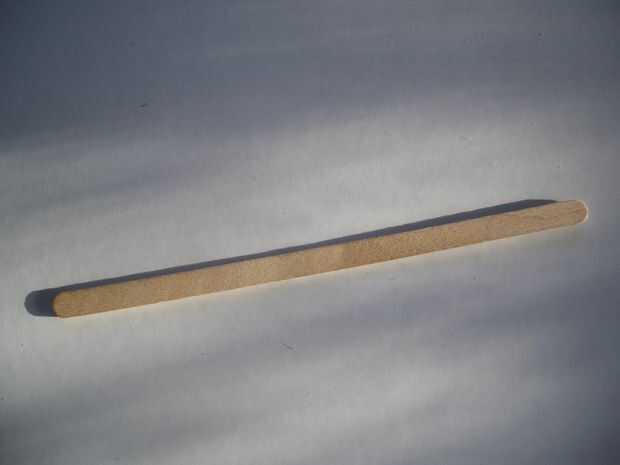 Para cada par de ranuras que se necesita una tira de madera suman 200mm (8 pulg) de longitud formado por dos café madera agitadores pegan unos encima de otros. Mi agitadores fueron sólo de 140mm de largo por lo que necesitaba para utilizar 4 de ellos. Empezar por pegadas a los agitadores en pares con pegamento para madera, ponerlos bajo un libro pesado hasta que el pegamento esté completamente seco para evitar la deformación. Luego lijar los bordes para hacerlas nivel. Vio las cintas en tiras de 5cm y alrededor de un extremo de cada longitud usando papel de lija grueso. Por último, alisar los extremos (los cuadrados y los redondos) con papel de lija más fino.