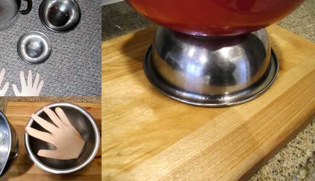Una vez que las manos han cocido al vapor cuidadosamente saque vapor y colocar entre dos de los tazones apilables y hacer un sándwich madera: tazón de fuente más pequeño > recorte de madera > tazón más grande.