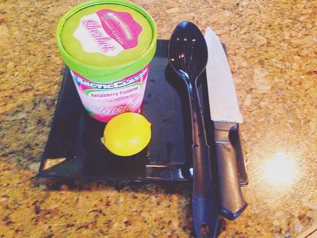 Primero que desea salir de sus ingredientes. Se necesita un cuchillo, tenedor, tabla de cortar o placa, limones y un sorbete de frambuesa.