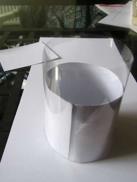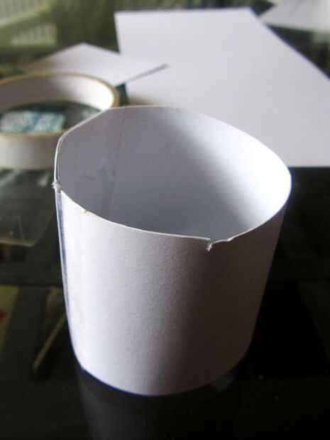 Empezar haciendo la pieza central, la Copa. Hacer a la taza, primero el molde. Corte una tira de cartón, rodar en un tubo corto, posición en cuclillas y asegúrelo con un par de trozos de cinta. Sentado en el platillo para probar el tamaño. Utilicé un platillo 12 cm de diámetro, y pedazo de tarjeta de 18 x 5 cm, con sobre un centímetro de longitud extra se superponen para un arreglo.