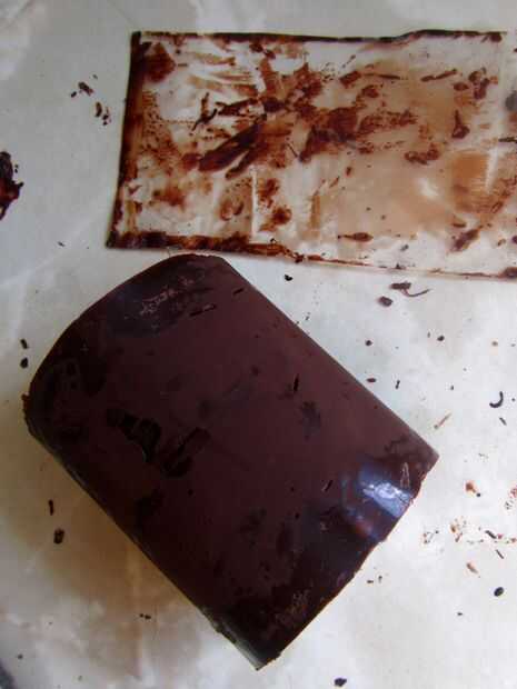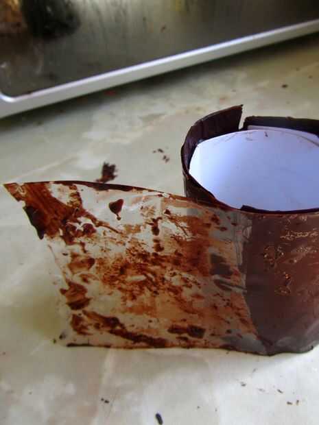 Para la Copa, primero Pele la capa externa de acetato. Ahora cuidadosamente corte el celo asegurar la tarjeta y gire la tarjeta en sí mismo, rodando en un tubo de más. Esto debería ser lo suficientemente pequeños para eliminar sin agrietar el chocolate. Por último, retire la capa interior del chocolate.