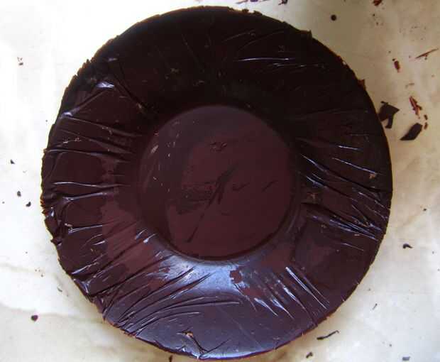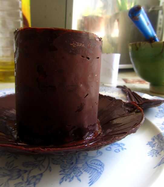 Para preparar la Copa de la mousse, de extensión o el tubo chocolate derretido un poco en el plato y colocar la taza en la parte superior. Llene adentro cualquier boquete obvio con más chocolate y deje que todo mientras haces la mousse.