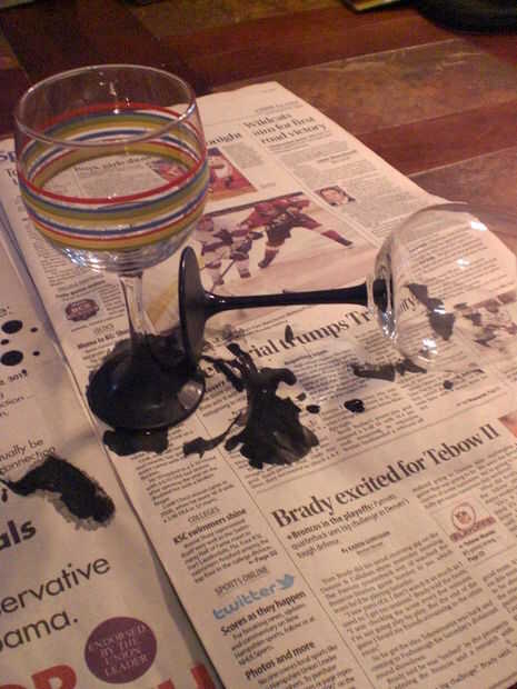 Tiene la opción de sumergir el vástago de su copa de vino en la pintura o pintar el tallo con un cepillo de la esponja. Si sumergen el vástago, asegúrese de descansar el vidrio en su lado después así no se pega al periódico mientras se seca.