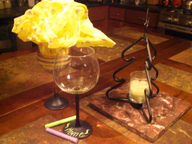 Permita que sus copas se seque durante la noche en un lugar seguro. Coloque un par de trozos de tiza en el cristal y decorar con el tejido y la cinta para una bengala añadida.