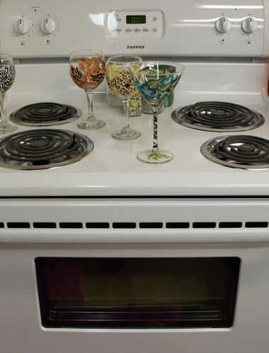 un conjunto barato de copas de vino puede ser disfrazado con alguna pintura de vidrio de la tienda de artesanía! Simplemente pintar remolinos alrededor de la parte inferior y la mejor parte de este proyecto, se recomienda imperfección! Se ve tan pers