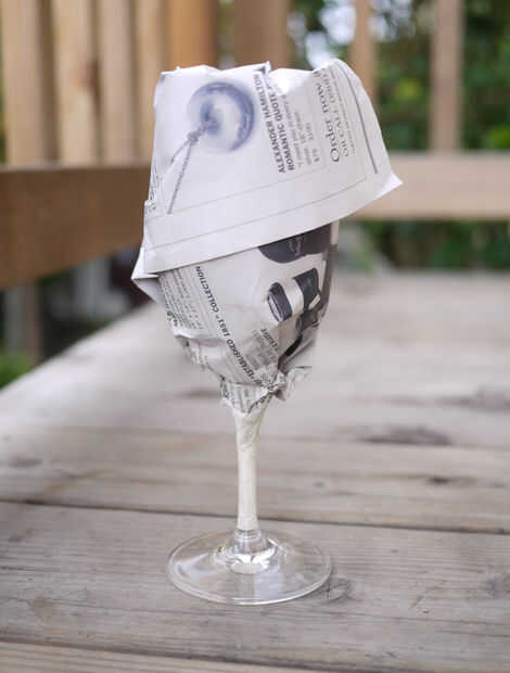Cinta alrededor del tallo donde quieras la pintura para terminar. Luego la cinta justo en un pedazo de periódico y el otro extremo dentro de la Copa de vino. Ahora has cubierto todo de que no queremos pintura de pizarra. Fácil!