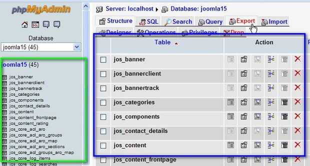 A la izquierda hay una lista de todas las tablas contenidas en la base de datos (verde). En la parte derecha (principal) de la pantalla de las tablas aparecen otra vez con un conjunto de acciones posibles para cada uno (azul).