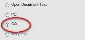 Más abajo en esta sección, es posible especificar qué tipo de archivo queremos crear. Compruebe que está seleccionado 'SQL'. Esto significa que somos capaces de utilizar este archivo para restaurar más tarde de los datos es necesario.
