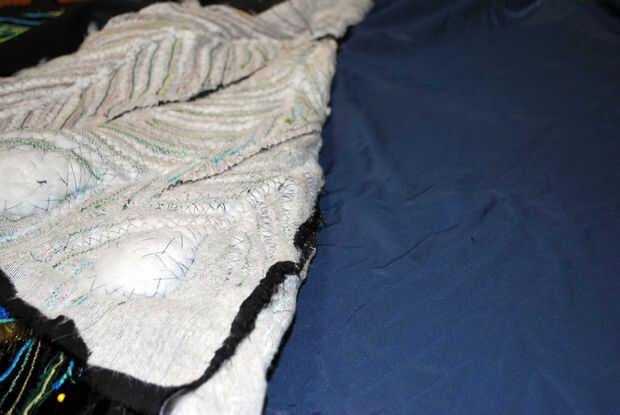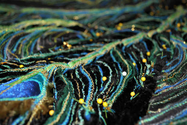 Entonces comencé a fijar el ventilador a la base, una sección de la pluma a la vez. La idea es precisar las áreas planas entre todas las hojas acolchadas, costuras y ojos. Cubrió una pluma en su lugar, había rodado el ventilador hasta exponer el terciopelo y alisaron el respaldo antes de pasar a la siguiente sección. Este es un proceso lento y molesto, pero es muy resbaladiza y se mueve mucho. Alternando la fijación y alisar pude mantener el terciopelo bastante incluso en el ventilador entero.