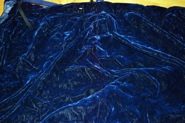 Encontré una falda de terciopelo azul ideal en una de mi favoritas de segunda mano tiendas, Americano manera ahorro en Burbank, CA. Son tiendas de ahorro genuino, lugares no "vintage", y apoyan manos ayudando para los ciegos y la Federación de cáncer. Quisiera apoyo de tiendas de segunda mano que hacen algo realmente bueno, en vez de lugares como la buena voluntad que contratan a personas por menos del salario mínimo.