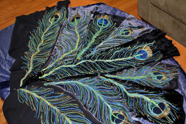 Para empezar, me lavó la falda y arrancó entonces abierta una de las costuras laterales por lo que podría diseñar plano. Luego se extendió mi abanico de plumas en la parte superior del terciopelo para averiguar donde encajaría mejor. El objetivo era cubrir toda la parte trasera del ventilador de la pluma con el terciopelo. Cuando me di cuenta de mi trabajo, he rechazado la parte borrosa de terciopelo sobre mi mesa de trabajo y alisó hacia fuera. Luego puse a la mitad del ventilador de la pluma en la parte superior, lado derecho hacia arriba. Continué suavizar el terciopelo mientras que rodó el resto del ventilador de la pluma hacia abajo.