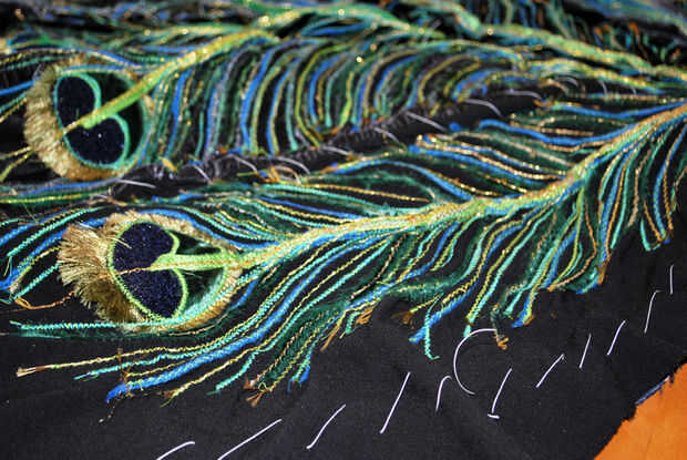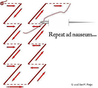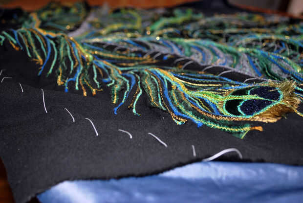 La puntada que usé es un cojín grande, suelto la puntada (ver el diagrama de arriba). Una puntada tradicional pad se utiliza para confección de cuellos y solapas-it tiene a la tela exterior para la interconexión. Es mucho demasiado quisquilloso para este proyecto. Quiero grandes puntadas que puedo ver fácilmente y sacar cuando llego al paso de coser de la máquina. Así que usar hilo blanco resistente a Hilvanar primero por todas las costuras entre cada sección de la pluma. Entonces Hilvanar hacia abajo los bordes todo el abanico de plumas. Yo no anudar mi hilo, ya sólo hará difícil sacar más adelante.