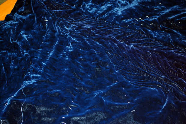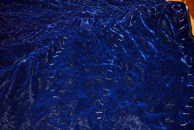 Intento mantener el terciopelo de agrupar para arriba mientras que cosa, pero siempre no puedo evitarlo. No importa cuánto pin e Hilvanar, el terciopelo todavía tiene sala de meneo. Está bien. Algunos plegamientos y agrupar se añade textura a un plano terciopelo azul forro. Si lo racimos demasiado, aunque, tengo que sacar mis pins e hilvanado y rehacerlos para el terciopelo todavía cubre el ventilador entero. Debía Hilvanar los bordes exteriores de mi fan un par de veces más y rehacer un montón de alfileres, pero finalmente todo salió.