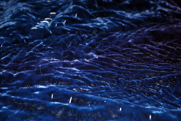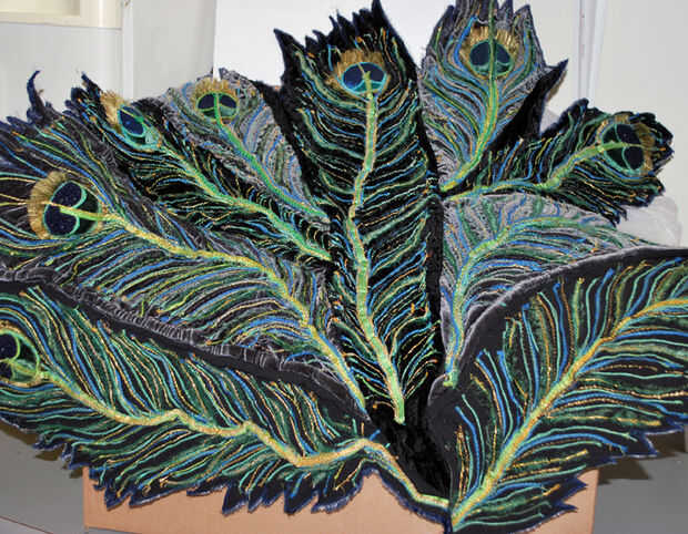 Considerar sección una pluma a la vez. Usar una puntada recta para coser entre cada hoja y en cada pluma de pavo real "ojo" en los espacios planos. Estoy usando hilo negro en las secciones de pluma negra y azul-gris en las secciones de terciopelo gris. Ambos de estos hilos se mezclan en bastante bien para el terciopelo azul forro. Puesto que los hilos son un buen partido, es un poco difícil saber lo que está sucediendo en las imágenes. Pero si usted mira de cerca, se puede ver el efecto acolchado en el forro de terciopelo.