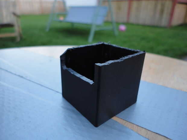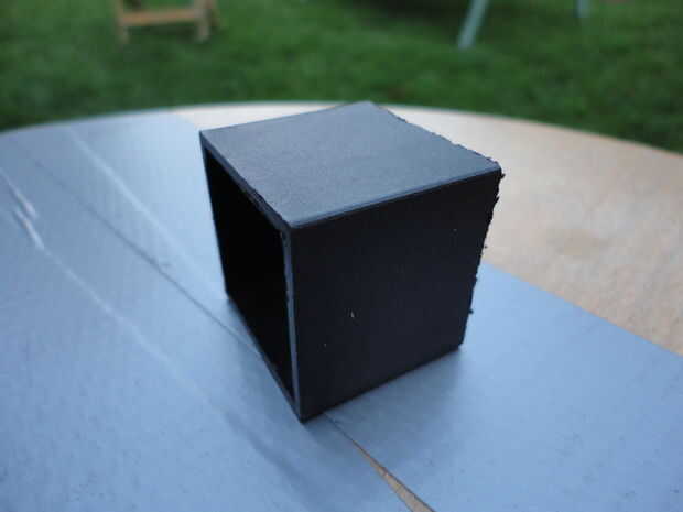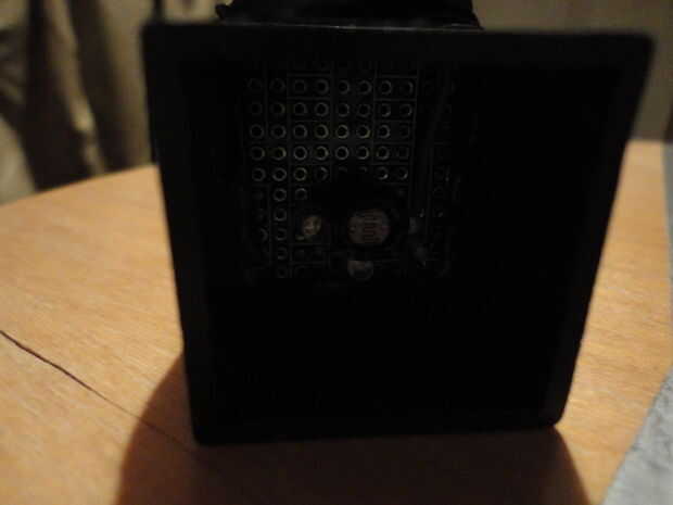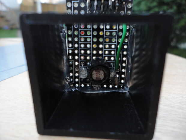 Una vez que el circuito está construido y la Sábana Santa se agrega a la fotocélula CdS, puede seguir adelante y el conjunto del sensor entero de la cubierta. No es necesario, pero ayuda el sensor para mantener un balance decente incluso cuando cambia la luz ambiente. Una ventaja añadida es que oculta todo el intermitente del sensor es lo. Usé un poco de plástico negro que tuve chutando alrededor de una luz del jardín para hacer mío.