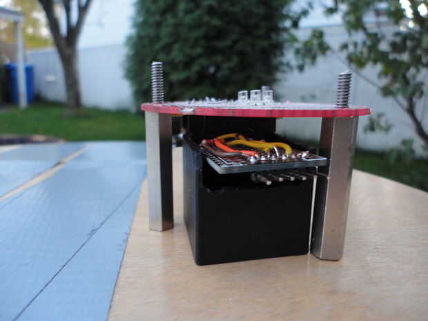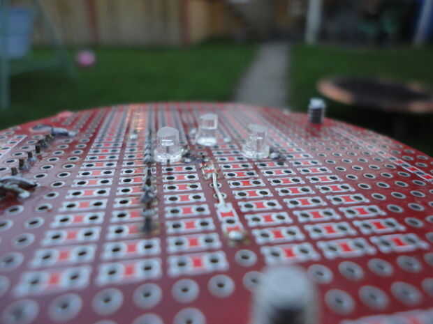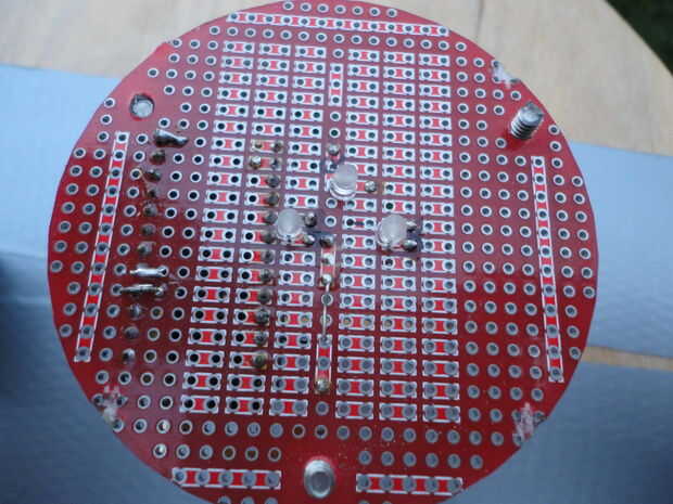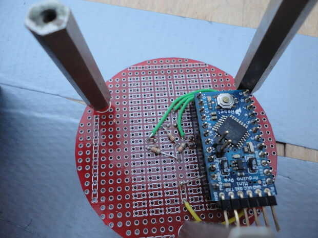 Cableado mío en una pequeña placa circular con un Arduino mini montado en la parte inferior. Pongo mi consejo sobre unos separadores que permitió mi sensor de color sentada debajo de la lámpara.