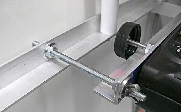 El brazo de pivote es ajustado y bloqueada en alineación con una varilla roscada de ¼" cerca de la mitad el ancho de la Junta larga. Puede utilizar una amplia gama de diámetros de la varilla roscada. incluso el mismo diámetro como las piernas.