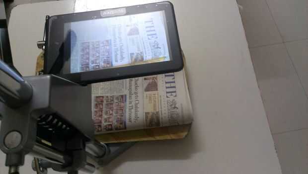Lugar el elegante teléfono o tablet con cámara hacia abajo el material (libro, documento o noticias papel!) que se analizarán en el soporte de hecho de alambre de acero. Enfocar moviendo hacia arriba o hacia abajo de la c-pinza de soporte de taladro. (utilice la llave Allen o lo que alguna vez herramienta aplicable a su taladro soporte. Foto que muestra la tableta en posición.