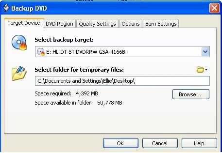 Ahora con esto configurado, haga clic en la copia de seguridad! botón. Seleccione la unidad de DVD para quemar con, pero dejar en el DVD de la tienda compró por ahora! También hacer una carpeta en el escritorio hacer temporal grabar archivos. Estos se pueden borrar más adelante. Antes de grabar asegúrate de seleccionar esta carpeta los archivos temporales. Lo escupirá hacia fuera y decir que poner en un espacio en blanco cuando su tiempo para grabar. Puede seleccionar regiones para dejar el juego de DVD. No planeo tomar estas fuera de los Estados Unidos, Canadá o México, por lo que sólo seleccionar región 1. Pero su hasta usted. Y siempre elijo la máxima suavidad en la siguiente pestaña. No soporto las películas nerviosos, por eso que elijo. Finalmente puede iniciar el proceso de copia de seguridad.