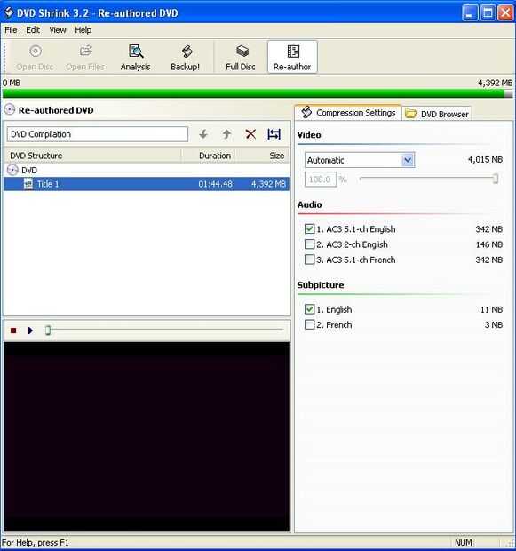 Un poco más sobre la compresión. Click en la ajustes de compresión en la parte superior derecha. Observe la barra en la parte superior. Verde significa que caben en el DVD y rojo significa que no se ajusta, así que si no cabe, sacar todos los idiomas excepto y los inglés. Los deje en o no tendrás ningún audio. Aunque usted puede sacar todos audio excepto la número 1, si elegir, pero eso es lo que te recomiendo. Establecer la cosa de compresión automática, y todo debe encajar bien en el DVD.
