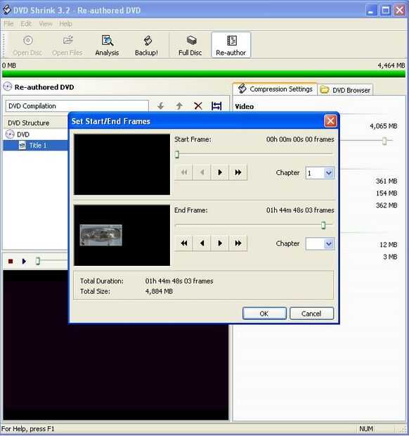 Una vez que se realiza en la parte superior izquierda, podrás ver tu DVD. Cerca de la parte superior derecha de este cuadro es un cuadro con dos arows uno frente al otro, haga clic en este botón. Este es el botón set start/end frames. Para reducir tiempo y compresión, tomar la barra inferior y deslícela izquierda hasta el inicio de los créditos. Esto saca los créditos.