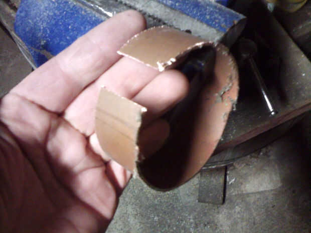 No tengo un tamaño de remache particular en mente. Me corte un poco de tubo de cobre, había martillado plana y enrollada para adaptarse a los huecos. Esto funcionó bien para mí, los puristas podrían temblar aunque ;)