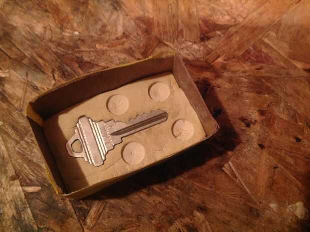 Ahora, vuelva a engrasar la cara del molde y sacar el resto de la moldura "masa." Firmemente Presione en la caja de cartón, asegurándose de que introduzca la masa en todos los detalles de la clave. Luego, coloque todo el conjunto bajo la lámpara de "horno" por un tiempo.