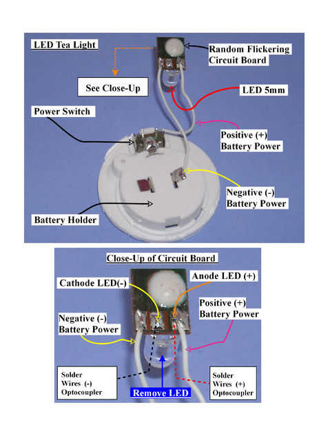 Luces de té todos se fabrican en dos tipos: uno es el circuito de parpadeo se construye en y dentro del LED que es visto por el punto negro muy pequeño en el LED parpadeante IC. Para usar este tipo de LED parpadeante alambre en paralelo otro LED con el parpadeo LED y también hará que parpadeo los otros LED. El problema con este método es que drena la batería de 3 voltios hacia abajo muy rápidamente.